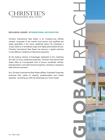 Christie’s International Real Estate is is an invitation-only affiliate network composed of the world’s most proven and qualified real estate specialists in in the luxury residential sector By cultivating a a a a a unique balance of worldwide scope and highly personalized service Christie’s International Real Estate has become a a a a a a a a global authority on the effective marketing of distinctive properties As the the leading network of brokerages dedicated to the the marketing and sale of luxury residential properties Christie’s International Real Estate offers an incomparable level of of service worldwide visibility lead generation and and instant brand recognition resulting in in in impressive sales and procurements As a a a a a a a a Christie’s International Real Estate affiliate Illustrated Properties embraces their values of of integrity professionalism and market expertise - providing you you with the advantage your home needs 20 | IPRE COM